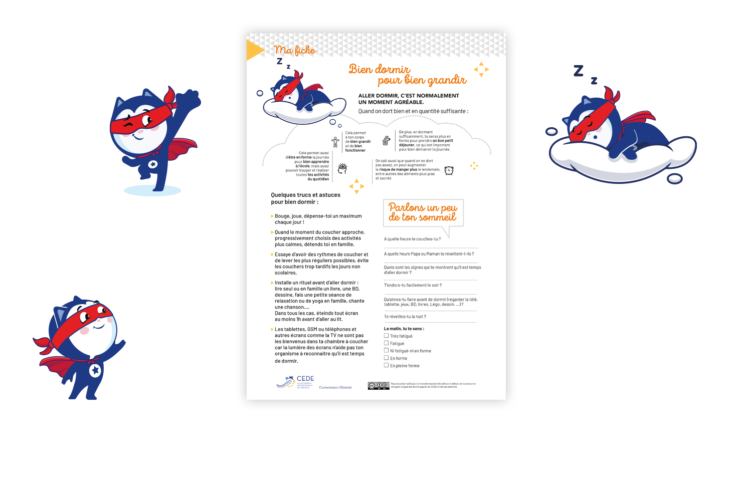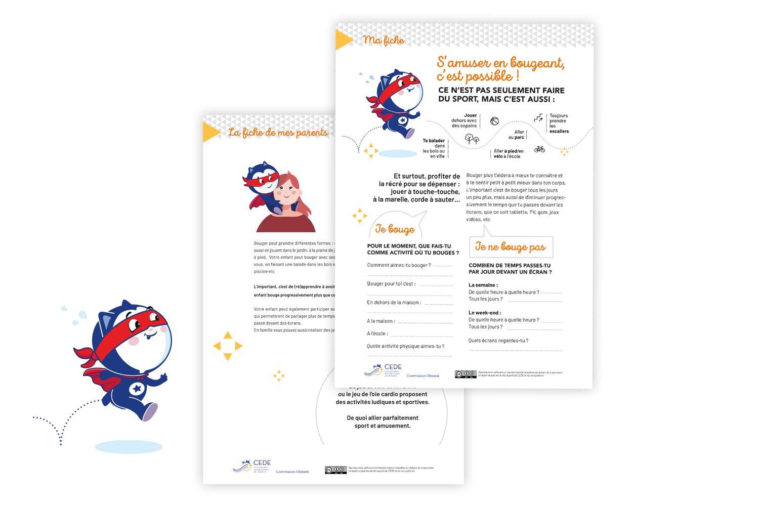 Pour cela j’ai créée et illustré une mascotte qui aborde 16 thèmes (sommeil, activité physique, diversité des aliments, des os solides, le petit-déjeuner, le repas principal, le goûter, les émotions, les portions, le repas au restaurant, les portions…).
